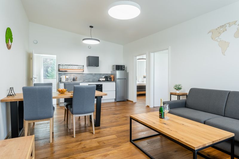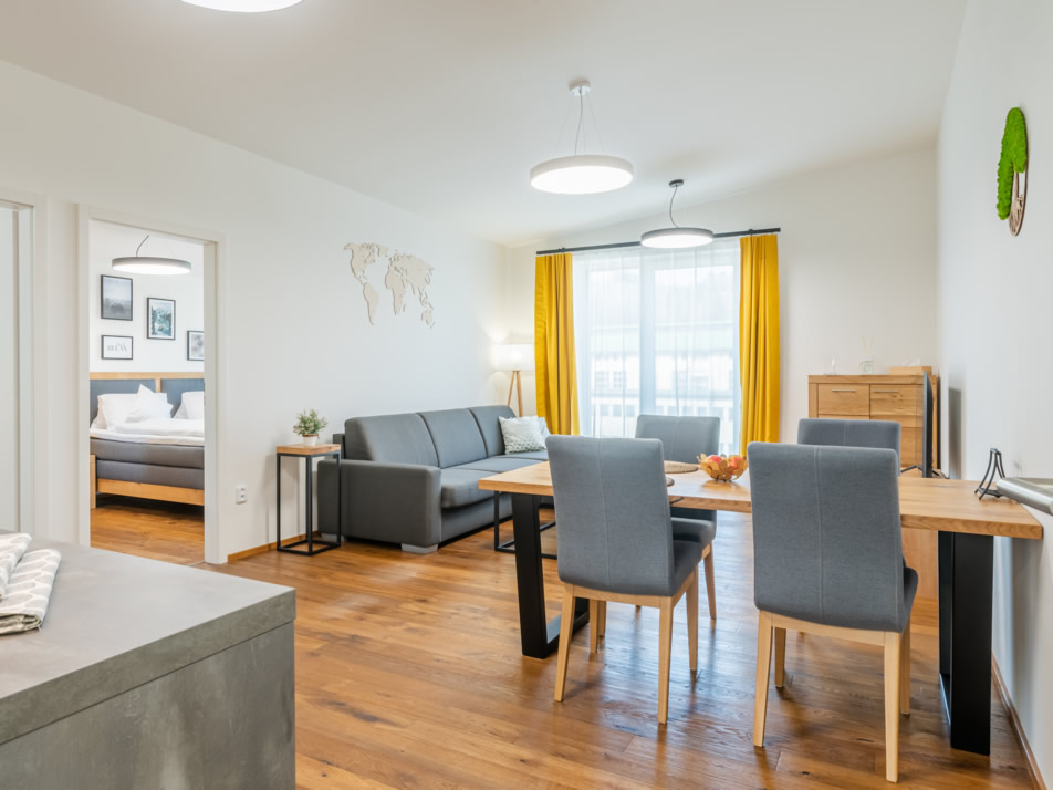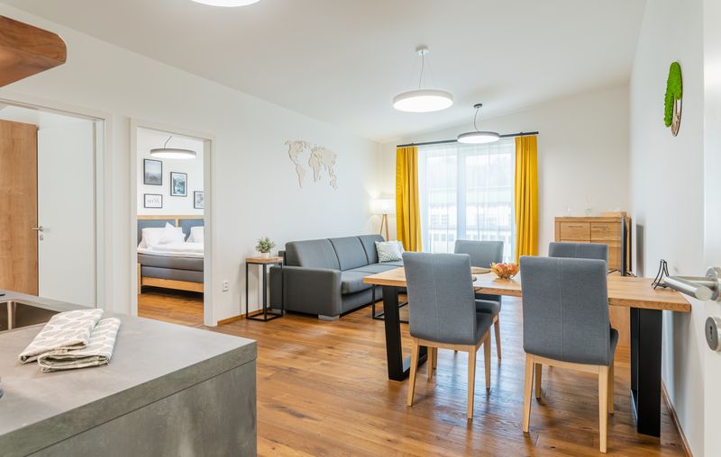 Luxusní apartmán se dvěma ložnicemi a balkonem v 2. patře nabízí veškerý komfort, který byste si na své dovolené mohli přát. Apartmán je plně vybaven, a to včetně spotřebičů – ledničky, pračky, myčky a mikrovlnné trouby. Přístup na wifi a televize jsou samozřejmostí. Apartmán je podlahově vytápěn. Balkon je včetně posezení. Na vyžádání je k dispozici i dětská postýlka. Apartmán je nekuřácký.